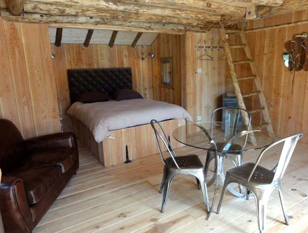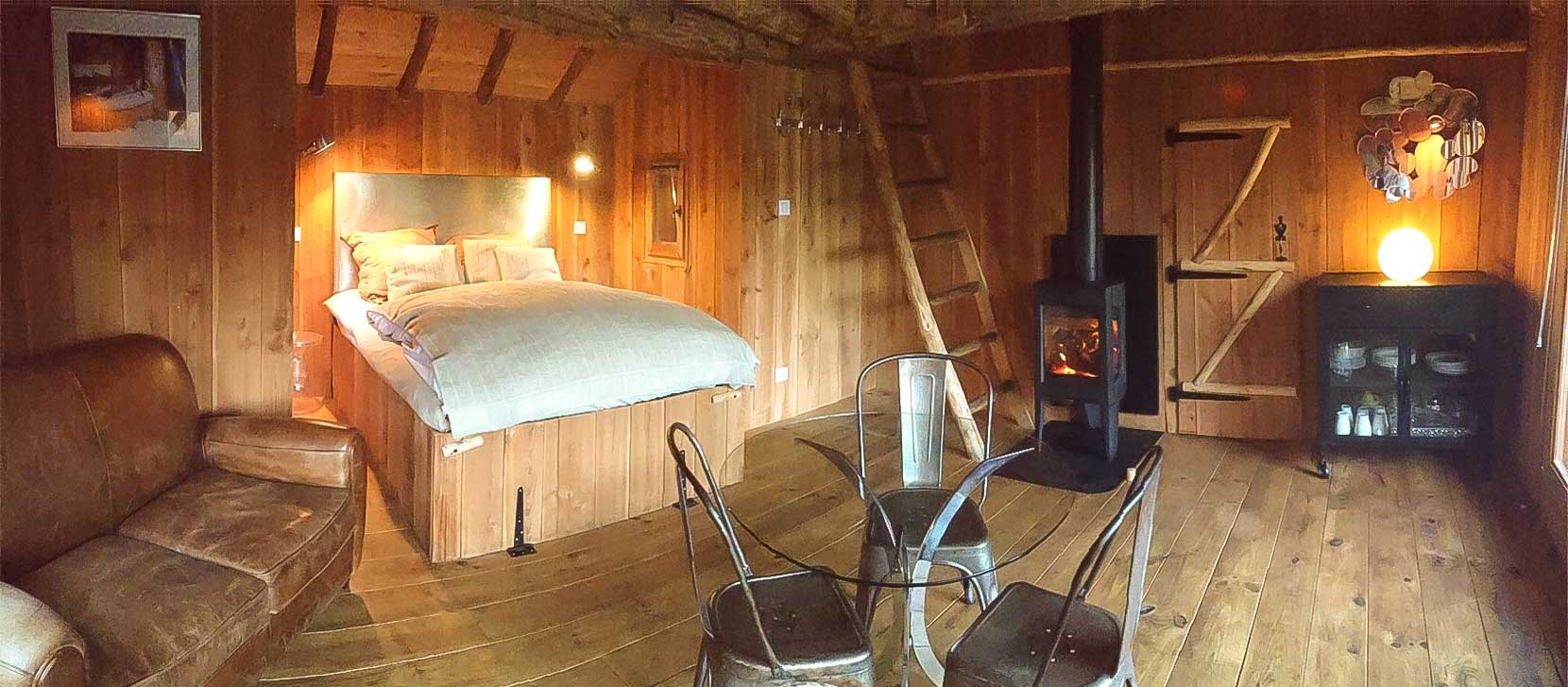 Un grand lit, une petite cuisine (sans arrivée d'eau), une jolie table et ses chaises vintage , un poêle à bois pour vous réchauffer ou pour créer votre ambiance ainsi que des toilettes sèches occupent le rez de chaussée. A l'étage, ouvert, se trouve 3 lits simples pour accueillir les enfants qui, de leur hublot, pourront scruter la nature.
